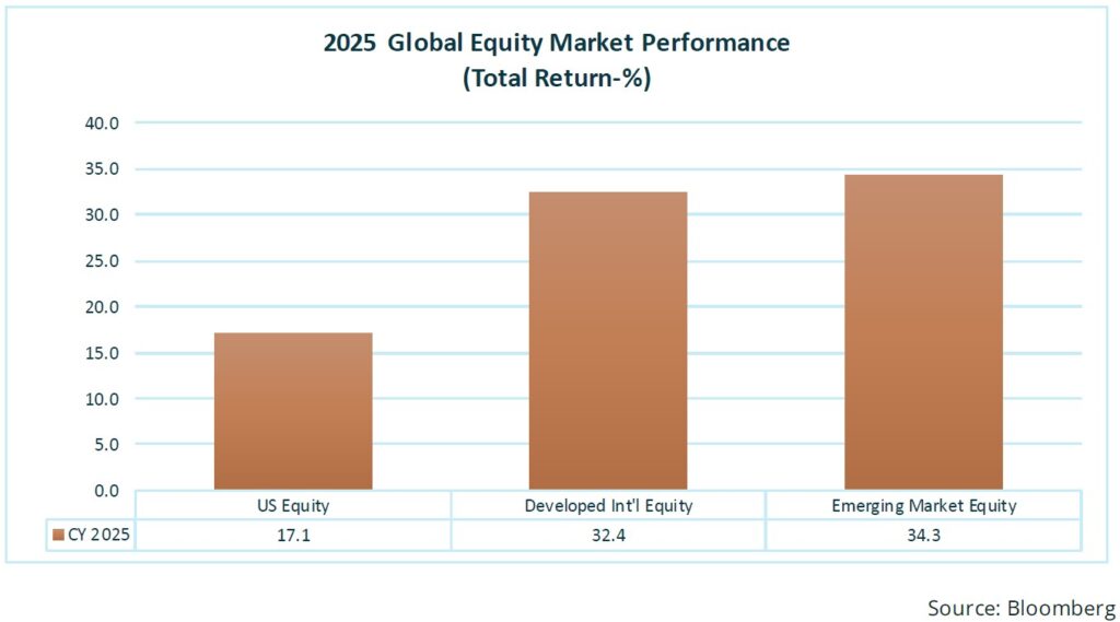 If 2025 was a good year for staying invested, it was an even better one for being globally diversified. After several years of disappointment, international equities finally held up their end of the bargain. Non-U.S. markets outperformed the U.S., aided by appealing starting valuations, better earnings growth abroad, and a slightly weaker dollar. Emerging markets benefited from stronger domestic fundamentals and capital inflows seeking opportunities beyond American shores. For globally allocated investors, those who stuck to their policy weights even when it was hard, the year served as a timely reminder: Diversification is often uncomfortable, but comfort is rarely profitable.