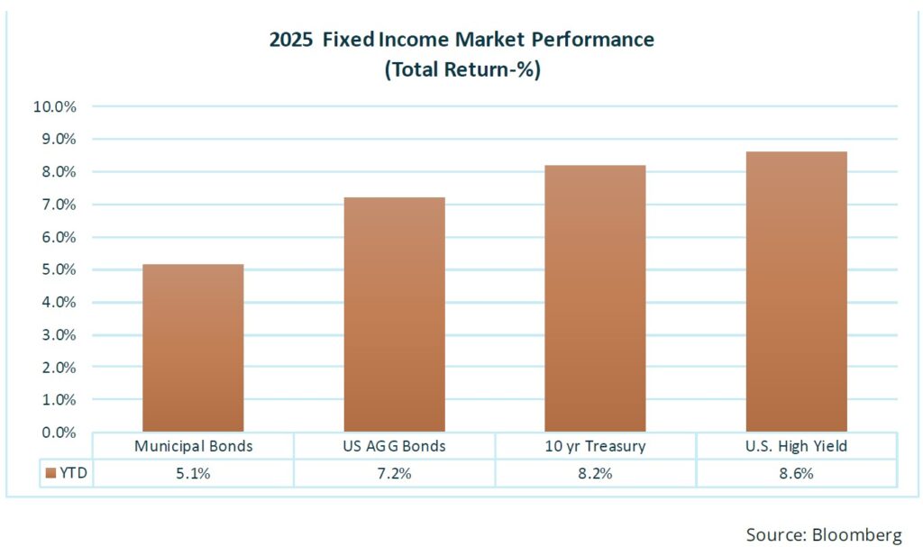 Fixed income in 2025 delivered on both sides of the ledger, with investors rewarded by strength in both interest rate and credit exposure. As inflation eased and growth settled into a steadier, less worrisome pace, yields drifted lower across the curve, turning duration from a source of prior-year pain into a meaningful contributor to returns. At the same time, a still healthy economy, strong corporate profitability, and generally sound balance sheets kept defaults subdued and left credit spreads hovering near their historical lows, allowing investors to earn attractive spread income without having to venture too far out on the risk spectrum. After several years in which stocks and bonds too often declined together, 2025 felt like a throwback to a more traditional world—one in which fixed income once again provided both income and ballast, and diversified portfolios behaved the way their architects had intended. As the accompanying chart shows, both credit and duration produced total returns exceeding 8% for the year, underscoring just how rare and rewarding this combination proved to be.