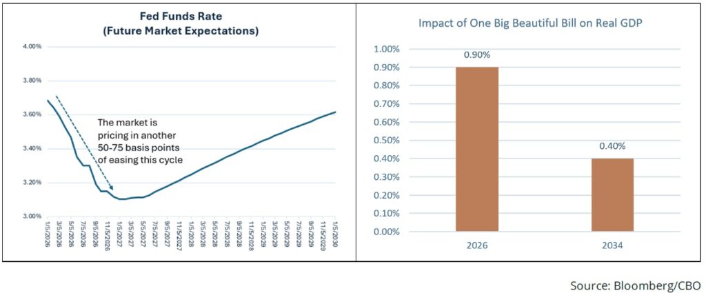 In addition to monetary policy accommodation in the form of lower rates and an expanding Fed balance sheet, the OBBBA is set to provide a meaningful fiscal tailwind as 2026 begins, with the Congressional Budget Office estimating the legislation will lift real U.S. GDP by about 0.9% next year. A key channel is consumer-focused tax relief: Households are projected to receive significantly larger refunds in early 2026, helped by a higher standard deduction, enhanced child tax credits, and new deductions that effectively lower the tax bill for many working and middle-income families. In parallel, the bill introduces tax incentives for private-sector investment to pull forward capital spending and expand productive capacity. Taken together, these consumer benefits and investment incentives should support demand, encourage hiring and capex, and amplify the growth impulse from easier monetary policy in 2026.
