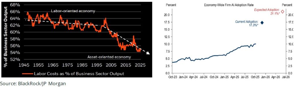 One helpful way to frame that income statement impact is as a classic cost story rather than a pure growth story: If AI succeeds in trimming labor costs as a share of output by even a few percentage points, and if most of that saving accrues to corporations while the rest flows to AI providers, the implications for margins and free cash flow are substantial. In that world, companies with large, repeatable, process-driven workloads would see meaningful improvement in unit economics, while a parallel ecosystem of platforms and service firms would enjoy growing, annuity-like revenue streams. So far, much of the market’s strength has been rooted in real earnings growth, particularly among the firms at the center of the AI buildout, where double-digit profit gains and strong free cash flow generation have validated at least part of the excitement. The pricing today reflects not only continued spending but also a powerful assumption: That AI will sustain the productivity and margin improvements that began years ago and carry them forward. As the chart below illustrates, we’ve seen a ~10% reduction in labor costs as a percent of revenue since the 1990s. While not guaranteed, it seems plausible that the rapid increase in AI adoption across the economy will sustain this trend.