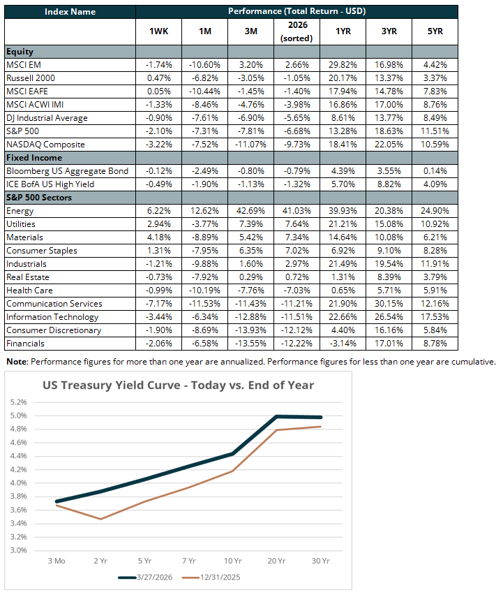 U.S. equities declined as the ongoing conflict in the Middle East continued to dominate market sentiment. The S&P 500 posted its fifth consecutive weekly loss, falling 2.1 percent during the week, while the NASDAQ Composite dropped 3.2 percent on weakness in technology, software, and memory names. The Bloomberg U.S. Aggregate Bond Index (the “Agg”), a broad measure of investment-grade fixed income, declined 0.1 percent, offering little of the ballast bonds have historically provided during periods of equity weakness. The NASDAQ has now declined in ten of the past eleven weeks, and the S&P 500 has touched its lowest level since early September. With equities and bonds both under pressure, traditional diversification has provided little relief for investors.