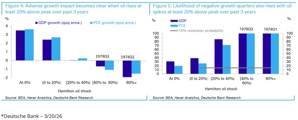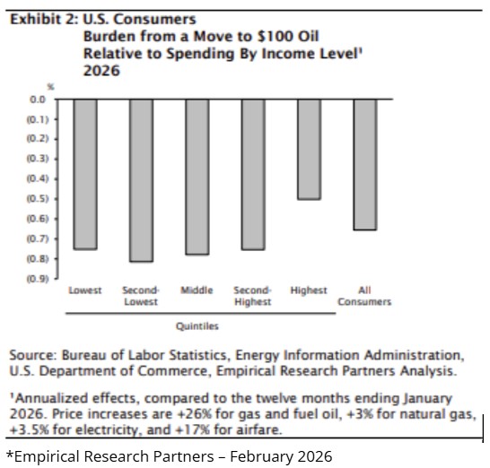 The sharp spike in oil was the dominant theme in the market during the first quarter of 2026. The primary transmission mechanism of higher oil to the broader economy is consumer spending, as consumers feel the effects of higher energy costs and later through higher goods inflation, which crowds out spending in other areas. As shown in the chart below, the sharp move in oil prices has the potential to materially pressure consumer spending.