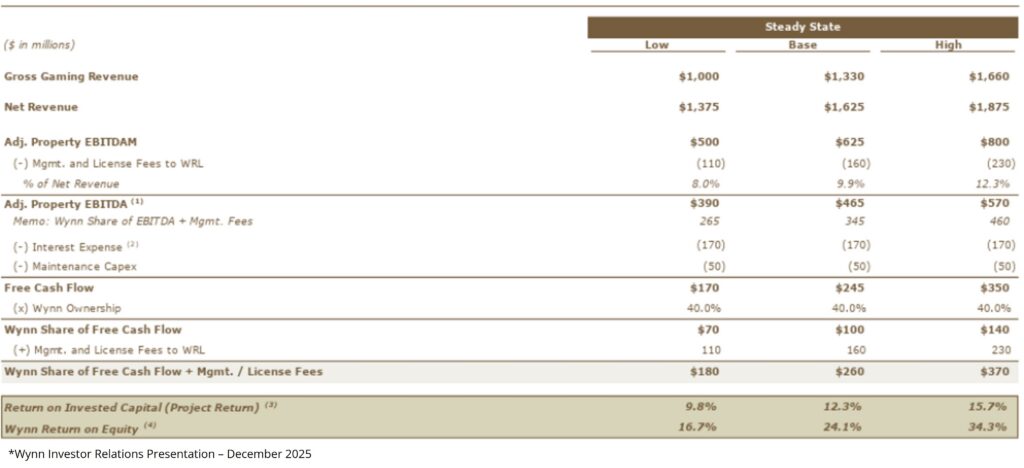 Wynn Resorts (WYNN) was one of our top detractors in the first quarter of 2026, decreasing 15.6%. The main driver of the weakness was the conflict in Iran. The company’s UAE facility was expected to be opened Q1 2027 but the military actions in the region have called the project timeline and return profile into question in the near to intermediate term. As seen in the table below, the estimated contribution from the UAE project to EBITDA and free cash flow is material.