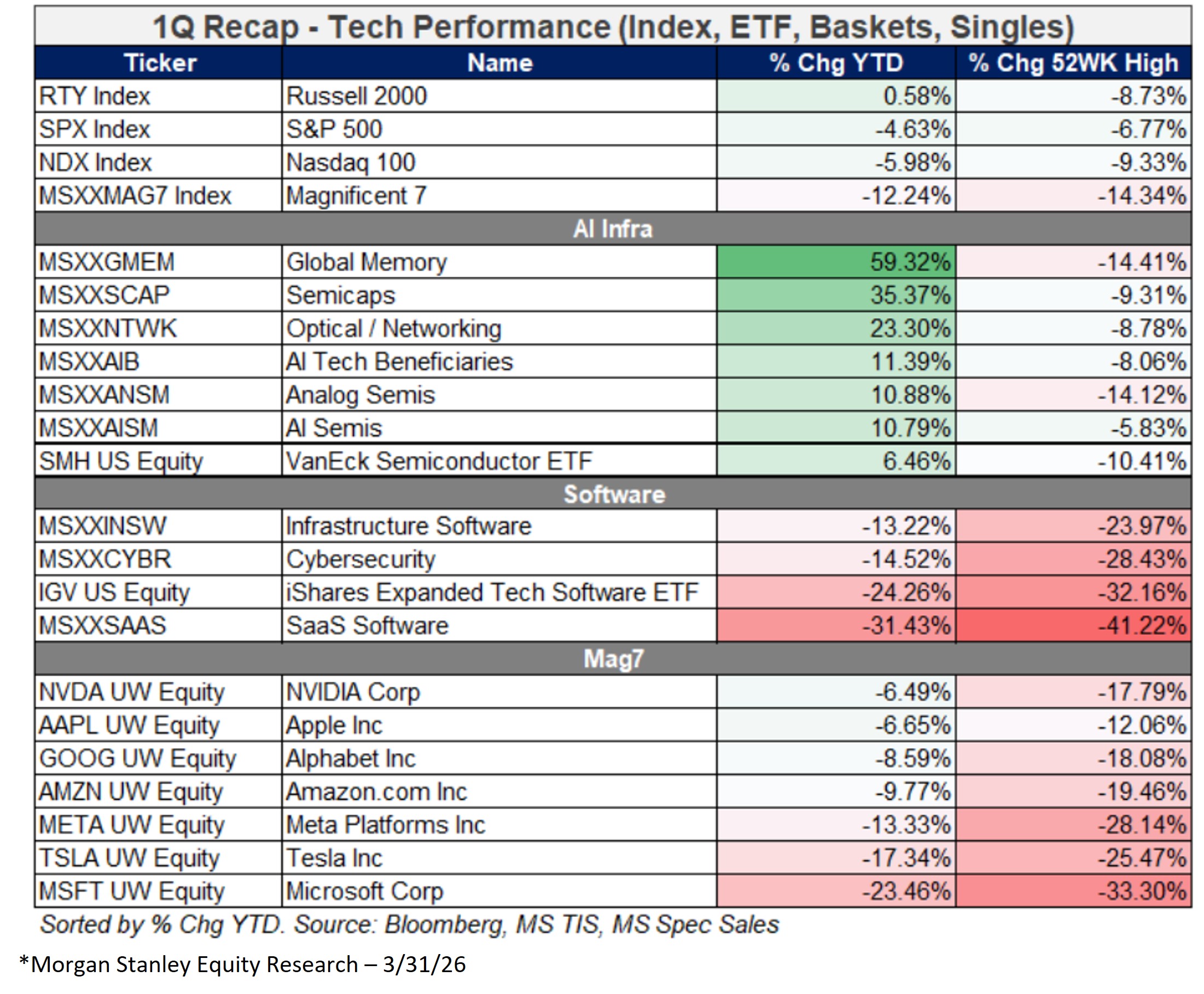 AI remains a dominant, longer-term theme in the market, but stocks in the AI bucket have started to show some performance dispersion. The table below shows the performance of various indices, ETF’s, baskets, and single stocks. And although the general trend of semiconductors outperforming software has held in Q1 2026, the performance within AI Infrastructure has shifted to Memory and Semi-cap equipment names.