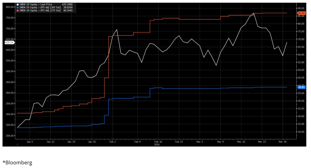 The memory sector was the standout performer in the quarter. SanDisk is one of the bellwether companies in the global memory industry, and the chart below shows its earnings revisions and stock price throughout Q1 2026. Shortages in memory created by demand from AI workloads have pushed memory pricing substantially higher than investors had expected, boosting earnings materially. For perspective, 2027 earnings expectations have gone from 22/share to 87/share in just the past few months. The stock has performed very well as a result.