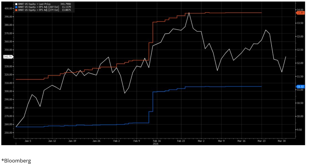 Applied Materials is the bellweather for semi-cap equipment. The chart below shows a similar dynamic where AI demand is driving better-than-expected results and outlook for the company, leading to higher earnings expectations and a higher stock price.