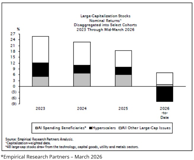 On the more negative side, the Consumer Discretionary sector was the weakest-performing sector in the quarter. As mentioned above, the rise in oil/gas prices is set to pressure discretionary spending. And a long, drawn-out conflict could be a substantially negative factor affecting consumer spending and the overall economy. The Technology sector was also weak during the quarter. The core driver of weakness was uncertainty surrounding AI-oriented spend. Hyperscalers like Microsoft (Azure) are key customers of AI hardware, and although those companies are financially sound, the ROI on their AI spend has yet to be fully determined. Companies like Nvidia, Broadcom, Microsoft, and Oracle weakened during the quarter. Also, as mentioned above, software has taken another leg down due to further disruption concerns. Communications Services also performed weakly during the quarter. Similar to Microsoft, Alphabet, and Meta Platforms are key customers of AI hardware and suffer from the same ROI on AI spend concerns.