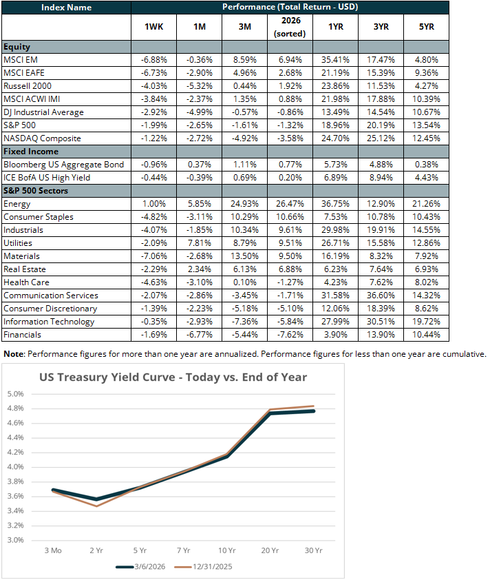 Much of the week’s market movement was tied directly to developments in the Middle East. U.S. equities initially shook off the attack on Iran but succumbed to pressure as the week progressed due to concerns that a prolonged and broadening conflict could be poised to destabilize the region. Oil prices surged as investors reacted to the growing risk of supply disruptions stemming from the conflict with Iran. The Strait of Hormuz, a critical maritime chokepoint connecting the Persian Gulf to the Arabian Sea, is in effect closed. According to the U.S. Energy Information Administration, roughly 20 million barrels of oil per day (~20 percent of the global supply of seaborne crude) passed through this waterway prior to the conflict. Major oil producers Iraq and Kuwait have begun cutting oil production due to full storage facilities. The sharp increase in energy prices pushed inflation expectations higher, raising concerns that inflation could remain more persistent than previously anticipated.
