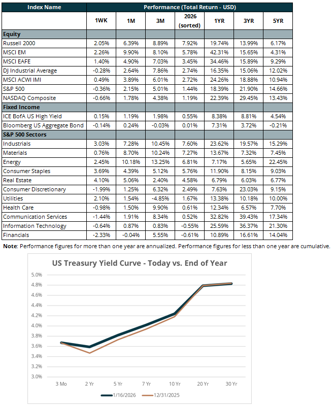 The top four U.S. megabanks (JPMorgan, Bank of America, Wells Fargo, Citigroup) all fell last week. Their shares dropped an average of 5.2%, making Financials the worst-performing sector for the week as well as year to date. A bright spot was improving credit quality. Wells Fargo’s credit card balances 90+ days past due, relative to outstanding balances, fell to 1.43% from 1.51% in Q4 2024. This is encouraging given concerns about a weakening consumer. Economists have described a K-shaped economy, in which low-income consumers have negatively diverged from their high-income peers. The low-income segment is more vulnerable to missed payments, so better delinquency data is a positive sign. The trend will be tested this week, when regional banks report. Ally Financial (ticker: ALLY), a major auto lender, reports on Wednesday, January 21.