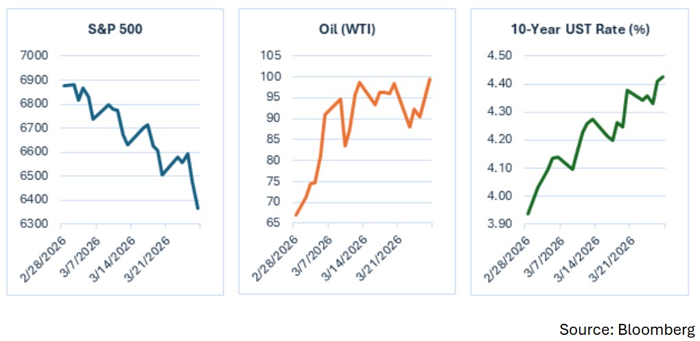 Then came a new geopolitical shock. The outbreak of hostilities in Iran shifted markets from rotation to retreat, igniting a sharp rise in oil prices and rekindling inflation concerns that had only recently subsided. The result has been a more cautious tone—one in which interest rates and energy prices have resumed their outsized influence over sentiment, and investors have adopted a distinctly risk-averse posture while waiting for the uncertainty to clear. Oil has spiked, reflecting one of the largest supply shocks on record; long-term U.S. Treasury rates are now flirting with 4.5% amid the inflationary impulse of war; and equities have sold off in a natural reaction to the uncertain economic backdrop.