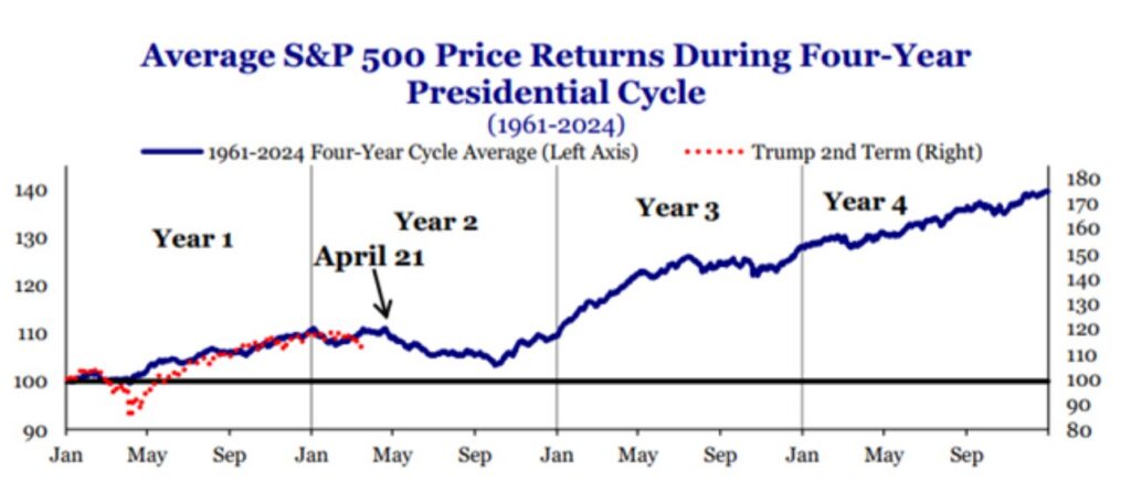 We’re also navigating another familiar but consequential force: the seasonality of domestic politics. History shows that markets often grow uneasy during midterm election years, when policy direction is in question and uncertainty weighs on sentiment. The data, shown in the accompanying chart, illustrate this pattern clearly—periods of strain in the second year of the presidential cycle have been a recurring feature since 1961.
