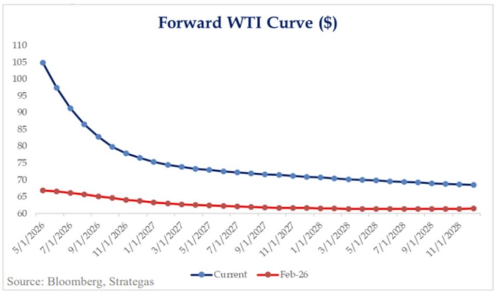 The forward curves tell a similar story for corporate input costs, particularly in energy‑intensive sectors such as transportation. The West Texas Intermediate (WTI) curve for 2027 and 2028 has shifted higher by roughly $10, implying a more expensive backdrop than investors expected just a short time ago. Even so, those levels remain within a range that the U.S. economy has historically been able to absorb; growth has persisted in past cycles with oil prices well above $70. The more immediate challenge is not the absolute level, but the speed of the move—businesses and markets adjust better to gradual change than to sudden repricing.