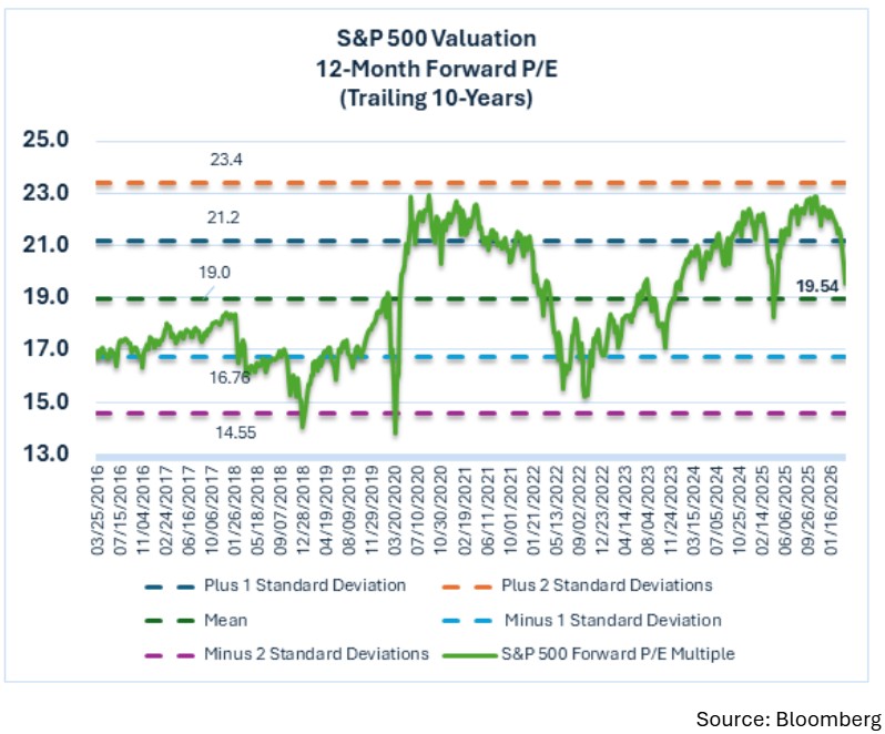 The S&P 500 has retreated about 9% from its January highs, marking a healthy recalibration rather than a collapse. As rising oil prices, interest rates, and geopolitical uncertainty weighed on sentiment, valuations have compressed meaningfully, with the market’s P/E multiple sliding from 22x to 19x in just a month. Yet beneath the surface, fundamentals continue to improve with analysts raising 2026 earnings forecasts by roughly 3%. In other words, while prices have adjusted lower, expected profits have inched higher, narrowing the gap between perception and reality and potentially setting up a more attractive entry point for disciplined investors.