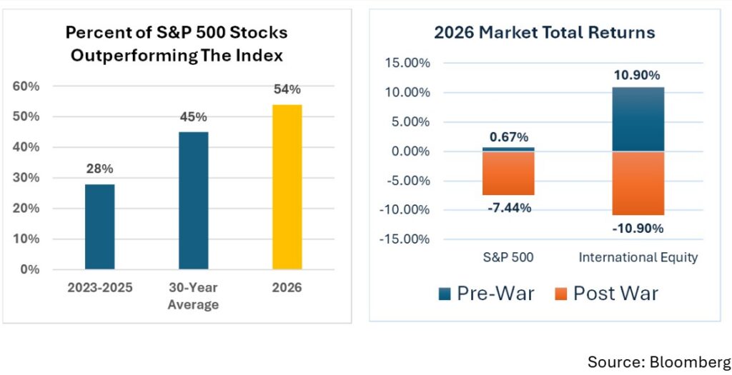The conflict dealt a blow to the narrative of synchronized global growth, especially for economies more directly exposed to energy shocks and with less policy flexibility than the United States, and pulled investors back toward the U.S. large-cap complex. In periods of genuine uncertainty, investors have a long history of favoring liquidity, scale, and perceived safety—all attributes that U.S. large-cap technology companies possess in ample supply. That instinct is understandable; though, it is not likely to be permanent. When the fog eventually lifts, there is good reason to think the case for a broader rotation will reemerge rather than vanish.