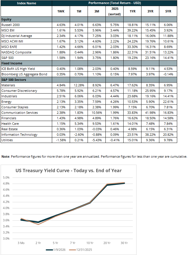 U.S. equities moved higher in the first full week of 2026. The Dow Jones Industrial Average, S&P 500, and Russell 2000 all finished the week at record levels, reflecting a continuation of the positive momentum that closed out last year. The S&P 500, an index of the largest U.S.-based companies, gained 1.6 per cent. Small caps fared even better, as the Russell 2000 surged 4.6 per cent. Markets appeared comfortable looking through near-term uncertainty, supported by expectations for stable U.S. economic growth and healthy corporate earnings in 2026.