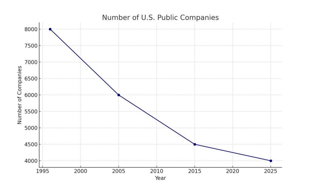 In the 1990s, there were more than 8,000 publicly listed companies in the United States. Today, there are fewer than 4,000. This phenomenon, often called “de-equitization,” is driven by rising regulatory costs, abundant private capital, and relentless M&A activity.