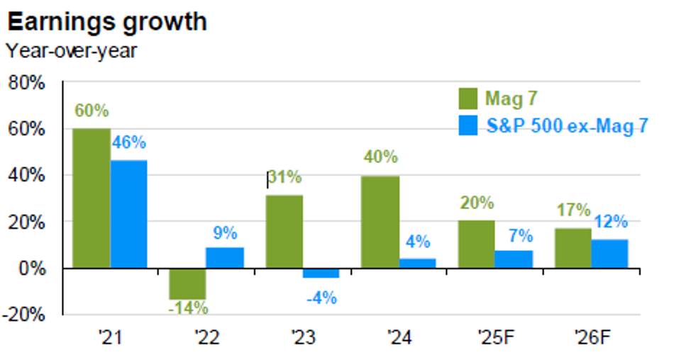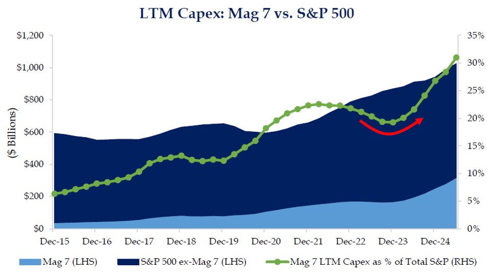 Recent research from Apollo shows that since January 2021, the top 10 companies have accounted for more than half of the S&P 500’s total returns. Earnings growth is concentrated almost entirely in the Magnificent Seven, while the rest of the index has shown little progress. These companies now represent over 30% of all S&P 500 capital expenditures, with hyperscalers alone comprising 7% of total U.S. private domestic investment.